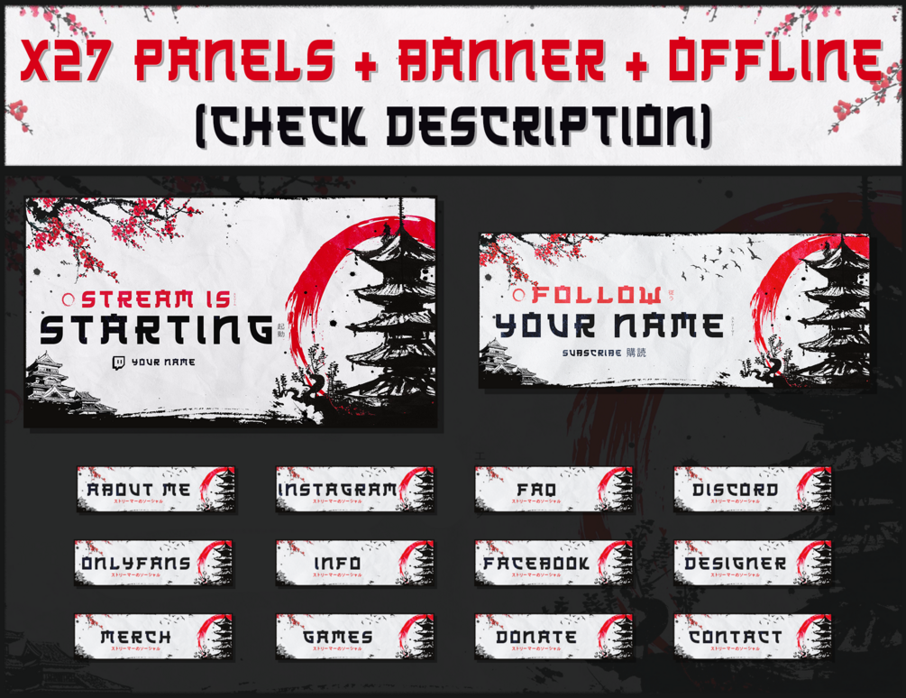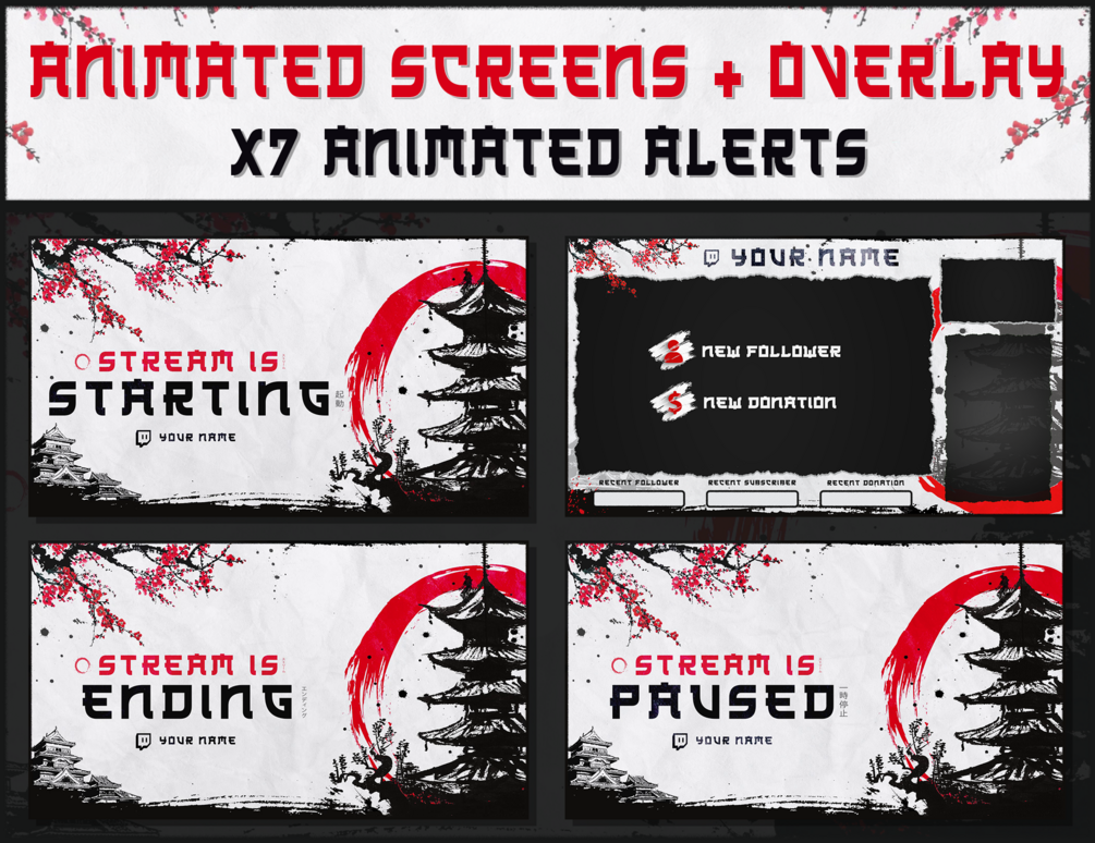 Japanese Animated Stream Overlay | Twitch | Youtube | Anime | Manga | Japanese | Alerts | Panels + Screens + Banner + Stinger Transition